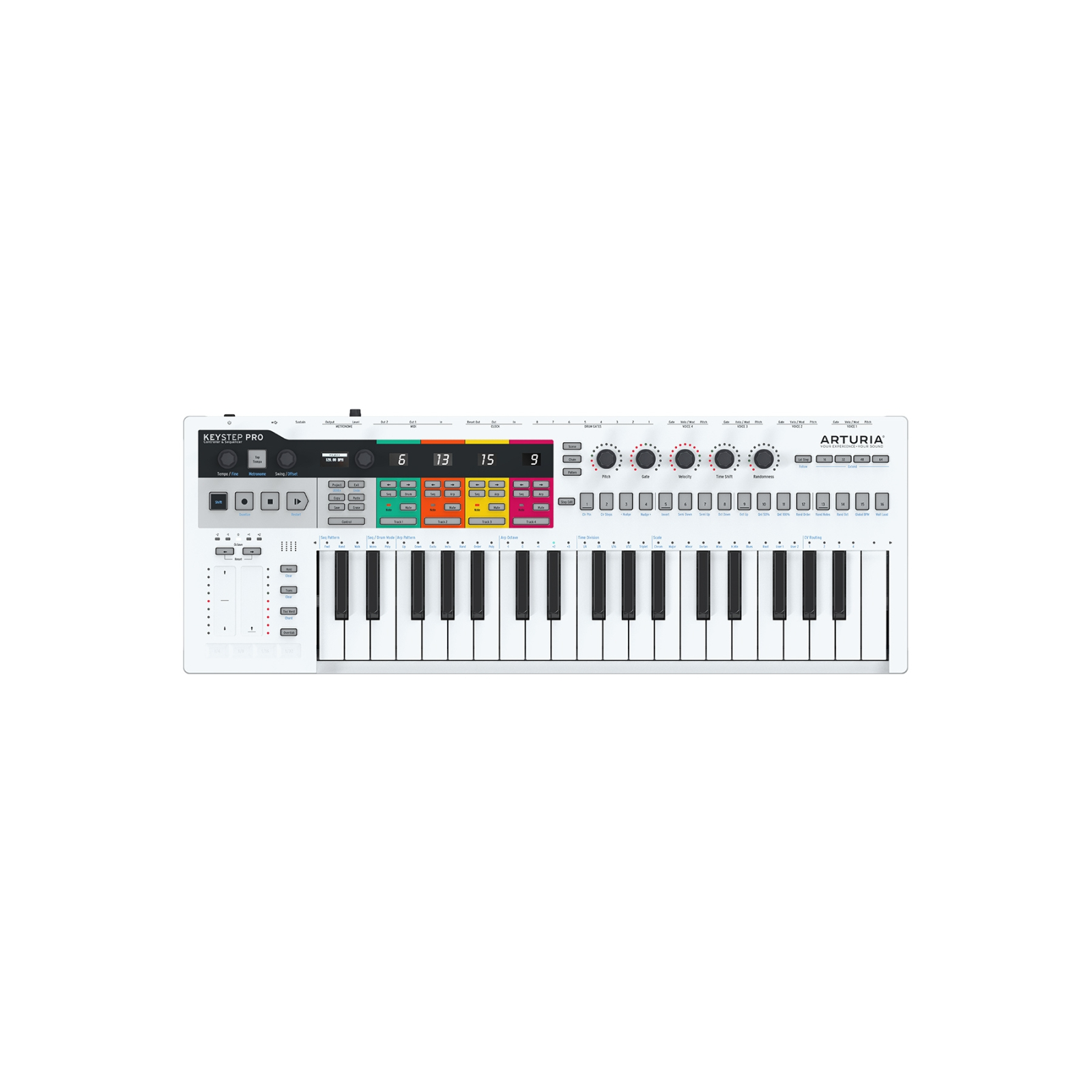 Arturia KeyStep Pro este o clapa MIDI cu 37 de clape sensibile la velocitate cu aftertouch si LED, 4-track sequencer, melodic sequencer, drum sequencer arpegiator, OLED display, Chord play, 8 knob-uri, 2 touchstrip (pitch/modulation) si 16 pad-uri RGB sequencing. Integreaza conexiuni MIDI I/O, USB, clock sync, 4 iesiri (CV, Gate, Mod) si 8 iesiri drum gate.