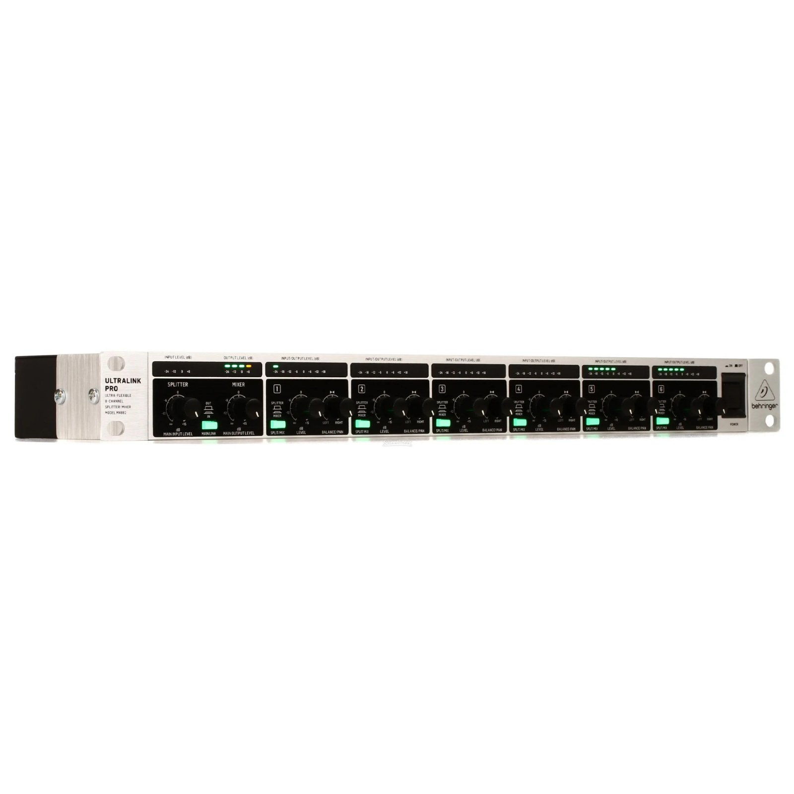 MX882 dispune de 6 intrari mono, 6 iesiri mono, 2 intrari principale si 2 iesiri principale, toate cu conectori XLR si 6.35mm TRS. Nivelurile de intrare si iesire sunt monitorizate prin intermediul indicatoarelor LED cu 8 segmente, oferind o vizualizare clara a semnalelor. Alimentarea interna comutabila (100-240 V) asigura un sunet fara zgomot si un consum redus de energie.